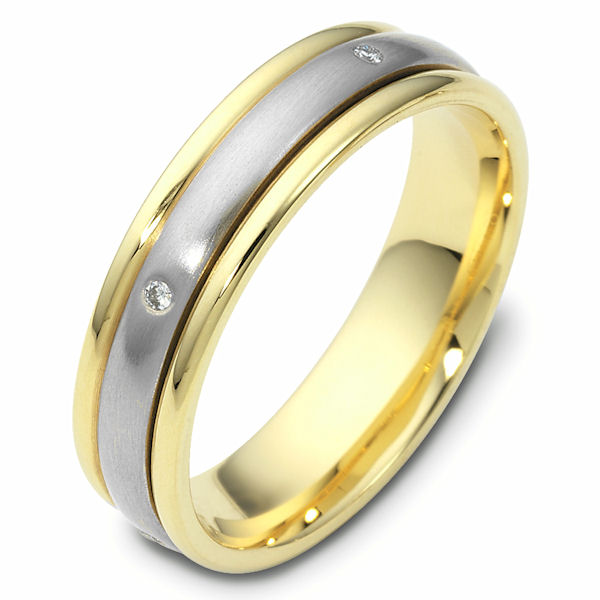 14kt Two-tone gold spinning diamond, comfort fit, 4.0mm wide wedding band. The ring has 0.05 ct tw diamonds that are VS1-2 in clarity and G-H in color. There are about 5 round brilliant cut diamonds, each measures 0.01 ct. The center portion of the ring rotates and has a matte finish. The edges are polished. Different finishes may be selected or specified.
