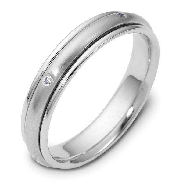 Palladium diamond spinning, comfort fit, 4.0mm wide wedding band. The ring has 0.05 ct tw diamonds that are VS1-2 in clarity and G-H in color. There are 5 round brilliant cut diamonds, each measures 0.01 ct. The center portion of the ring rotates and has a matte finish. The edges are polished. Different finishes may be selected or specified.