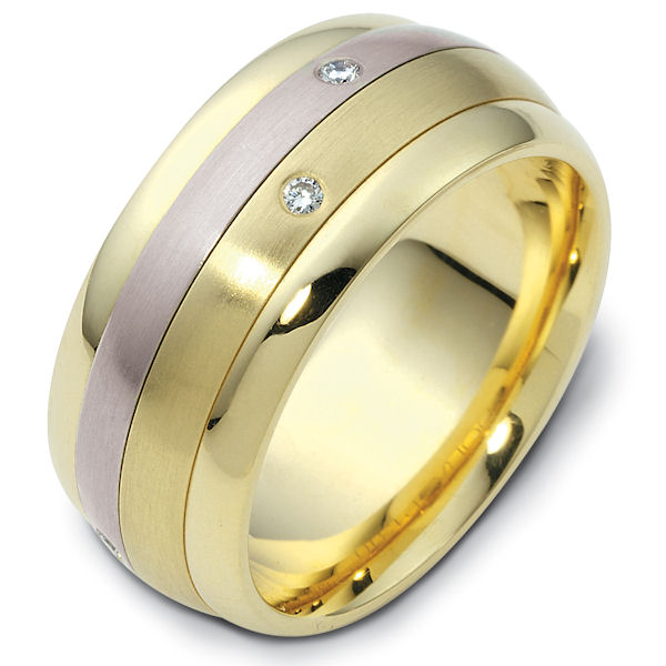 Platinum and 18kt yellow gold diamond spinning, comfort fit, 9.0mm wide wedding band. The ring has 0.09 ct tw diamonds that are VS1-2 in clarity and G-H in color. There are 6 round brilliant cut diamonds around the band, each measures 0.015 ct. The center portion of the ring rotates and has a matte finish. The edges are polished. Different finishes may be selected or specified.