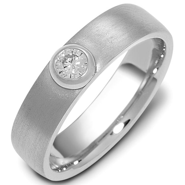 14kt White gold diamond, comfort fit, 5.0mm wide wedding band. The ring holds one round brilliant cut diamond that is 0.15 ct, VS1-2 in clarity and G-H in color. The ring has a sandblast finish. Different finishes may be selected.