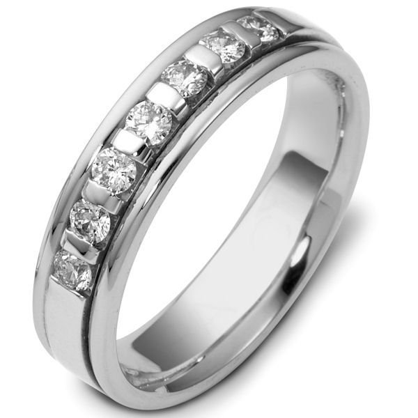 18kt White gold diamond, comfort fit, 4.5mm wide wedding band. The ring has approximately 0.28 ct tw diamonds, VS1-2 in clarity and G-H in color. There are 7 round brilliant cut diamonds and each measures about 0.04 ct. It is 4.5mm wide and comfort fit. The center is brushed and the rest of the ring is polished. Other finishes may be selected or specified.