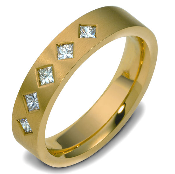14kt Yellow gold diamond, comfort fit, 5.5mm wide wedding band. The ring has approximately 0.50 ct tw diamonds, VS1-2 in clarity and G-H in color. There are 5 princess cut diamonds and each measures 0.10 ct. The ring is matte finish, 5.5mm wide and comfort fit.