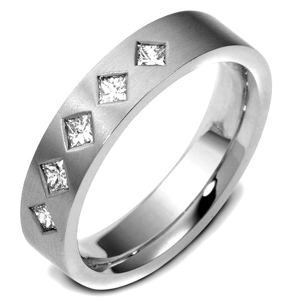 Platinum diamond, comfort fit, 5.5mm wide wedding band. The ring has approximately 0.50 ct tw diamonds, VS1-2 in clarity and G-H in color. There are 5 princess cut diamonds and each measures 0.10 ct. The ring is matte finish, 5.5mm wide and comfort fit.