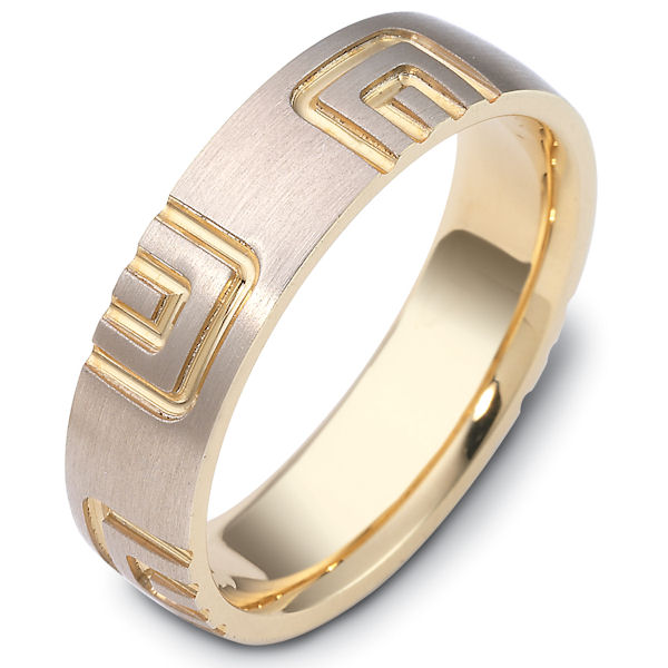 18kt Two-tone gold carved, comfort fit, 6.0mm wide wedding band. The ring has a carved pattern all around the ring. It is 6.0mm wide and comfort fit.