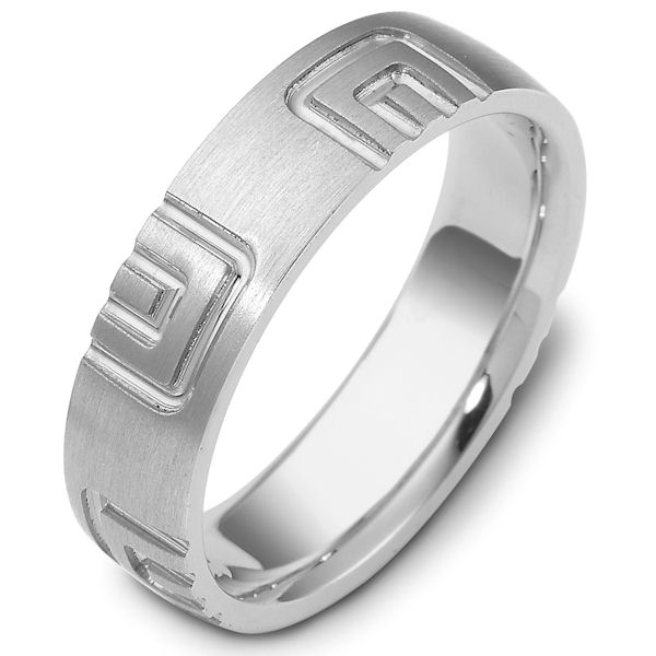 14kt White gold carved, comfort fit, 6.0mm wide wedding band. The ring has a carved pattern all around the ring. It is 6.0mm wide and comfort fit.