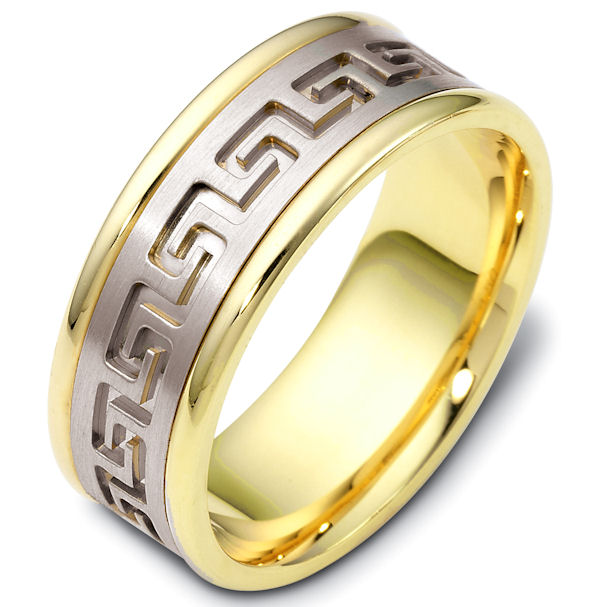 14kt Two-tone gold contemporary greek key, carved, comfort fit, 8.0mm wide wedding band. The ring has a beautiful greek key pattern around the whole ring. It is a matte finish in the center, polished on the edges, 8.0mm wide and comfort fit.