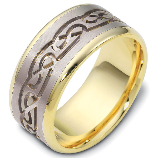 Platinum and 18kt yellow gold celtic carved, comfort fit, 9.5mm wide wedding band. The ring has a beautiful celtic pattern carved around whole band with a matte finish in the center and polish finish on the edges. It is 9.5mm wide and comfort fit.