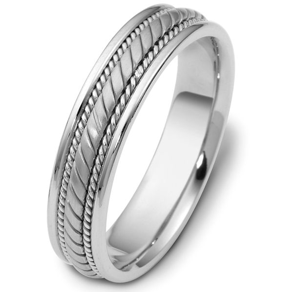 Platinum hand crafted, carved, comfort fit, 5.0mm wide wedding band. The center portion is carved and has a matte finish. There is one rope on each side of the center portion with a polished finish. The rest of the band is polished. Different finishes may be selected or specified.