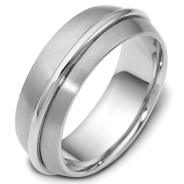 14kt White gold contemporary, comfort fit, 7.5mm wide wedding band. The raised white gold portion has a polished finish and spins around the ring. The rest of the band is matte finish. Different finishes may be selected or specified.