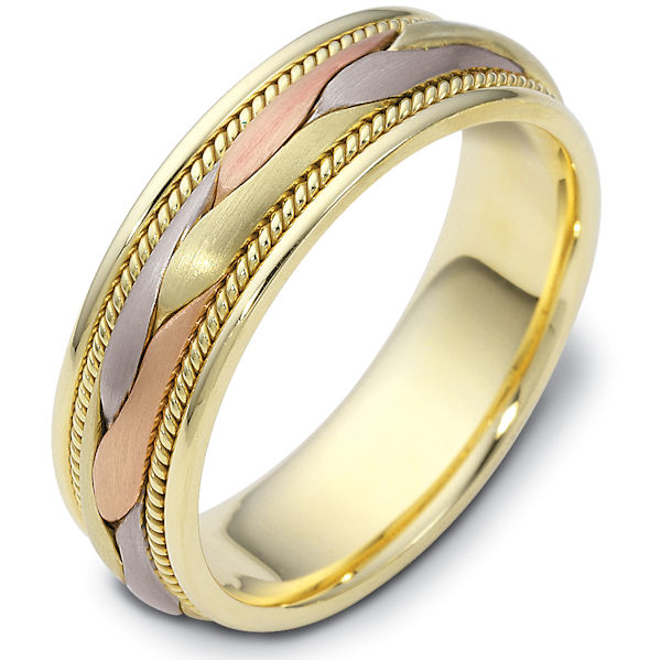 18kt Tri-color gold handcrafted, comfort fit, 6.5mm wide wedding band. The ring has a beautiful hand crafted braid in the center that has a matte finish. Next to the hand crafted braid is one rope on each side. Different finishes may be selected or specified.