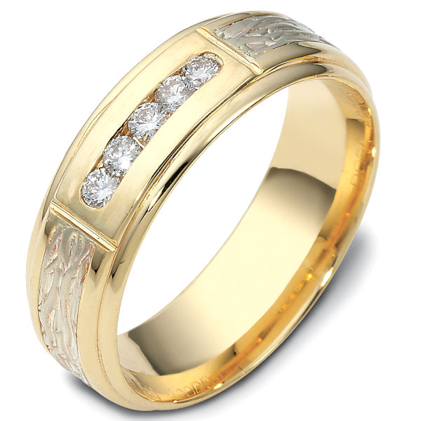 Platinum and 18kt yellow gold diamond, comfort fit, 7.0mm wide wedding band. The ring has 5 brilliant cut diamonds that are 0.22 ct tw. Each diamond is approximately 0.04 ct, VS1-2 in clarity and G-H in color. It is 7.0mm wide and comfort fit.