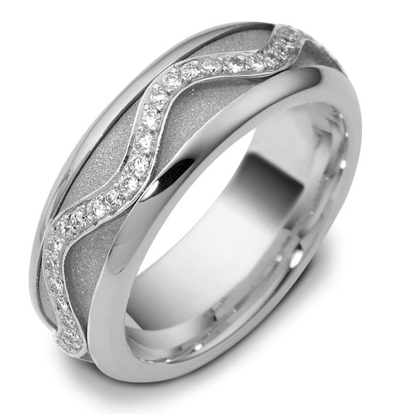 14kt White gold diamond, comfort fit, spinning, 7.0mm wide wedding band. The ring has approximately 0.30 ct tw diamonds, VS1-2 in clarity and G-H in color. There are about 60 round brilliant cut diamonds all around the band. The quantity and total weight of diamonds may vary depending on the size of the ring. The center of the ring spins. It is 7.0mm wide and comfort fit. The center of the band has a sandblast finish.