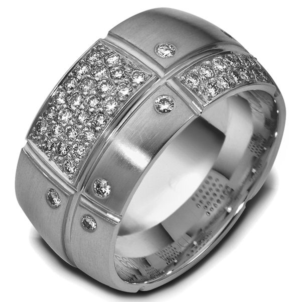 Titanium diamond, comfort fit, 12.0mm wide wedding band. The ring has 0.63 ct tw diamonds, VS1-2 in clarity and G-H in color. There are about 16 round brilliant cut diamonds, each measures about 0.015 ct and about 39 round brilliant cut diamonds, each measures 0.01ct with a total number of 55 round brilliant cut diamonds around the whole band. The ring is 12.0mm wide, comfort fit, and has a matte finish.