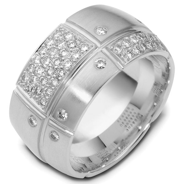 18kt White diamond, comfort fit, 12.0mm wide wedding band. The ring has 0.63 ct tw diamonds, VS1-2 in clarity and G-H in color. There are about 16 round brilliant cut diamonds, each measures about 0.015 ct and about 39 round brilliant cut diamonds, each measures 0.01ct with a total number of 55 round brilliant cut diamonds around the whole band. The ring is 12.0mm wide, comfort fit, and has a matte finish.