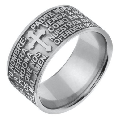 14K white gold Padre Nuestro (Lord's Prayer) wedding band. The wedding band is comfort fit.