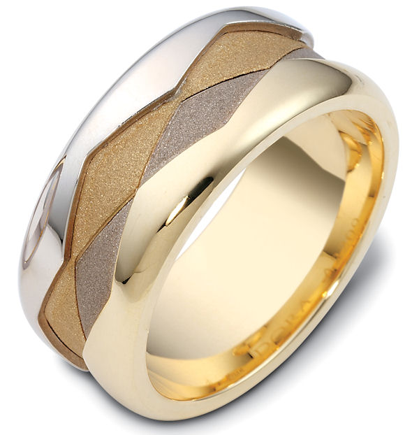 18kt Two-tone gold, comfort fit, 9.0mm wide wedding band. The ring has a sandblast finish in the center and high polish on the edges. It is 9.0mm wide and comfort fit.