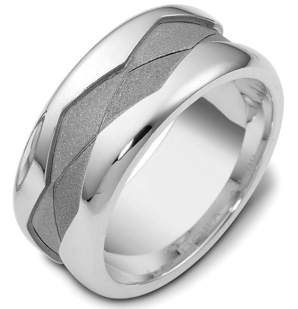 18kt White gold, comfort fit, 9.0mm wide wedding band. The ring has a sandblast finish in the center and high polish on the edges. It is 9.0mm wide and comfort fit.