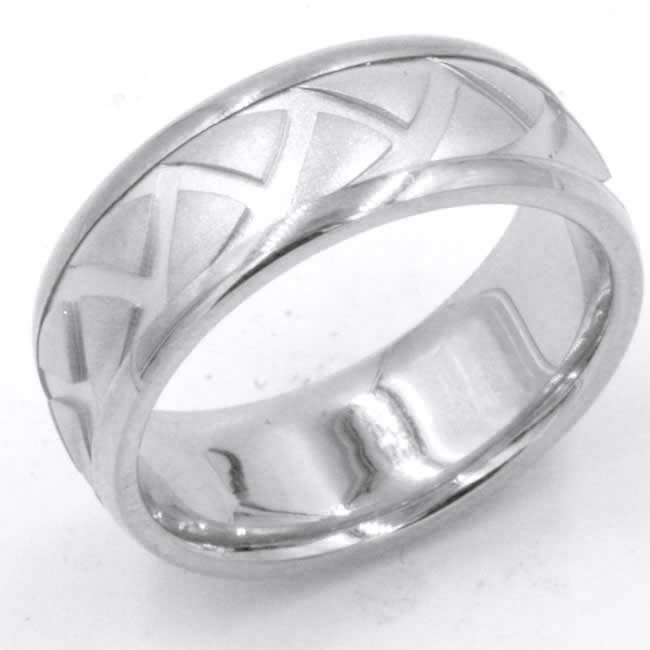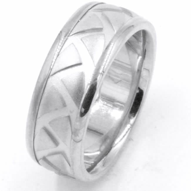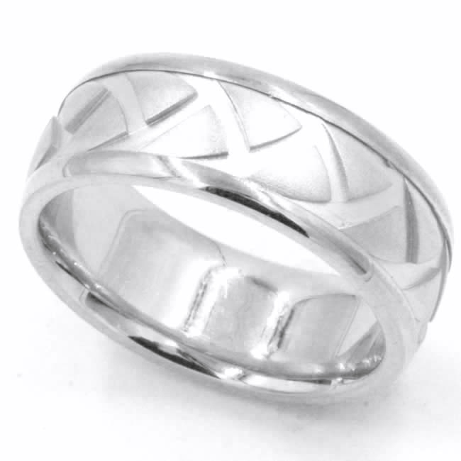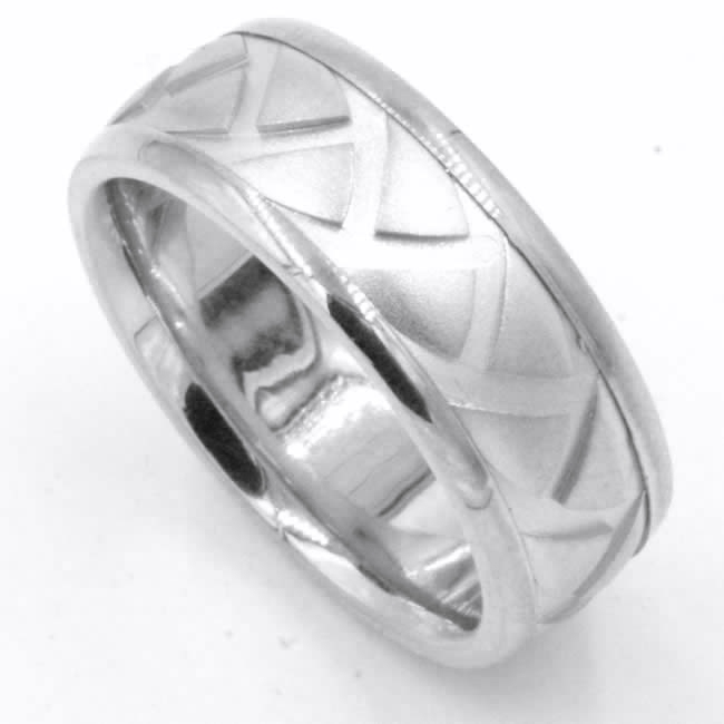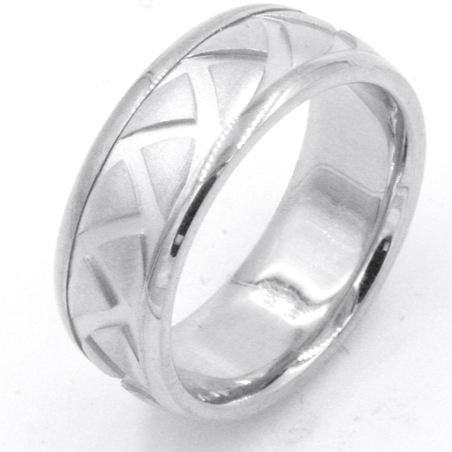 18kt White gold, carved, comfort fit, 8.0mm wide wedding band. The ring has a carved tire pattern throughout the ring. It is 8.0mm wide and comfort fit.