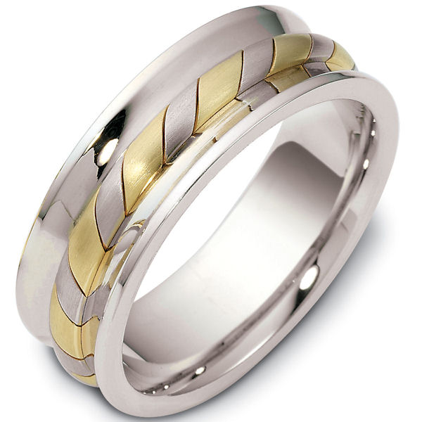 14kt Two-tone gold contemporary, comfort fit, 7.5mm wide wedding band. The ring has a beautiful handcrafted rope style pattern in the center of the band that is a matte finish. The rest of the band has a polished finish. Different finishes may be selected or specified.