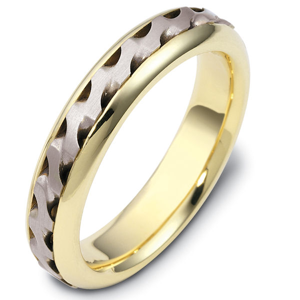 14kt Two-tone gold handcrafted, comfort fit, 5.0mm wide wedding band. There is a beautiful carved and crafted patter in the center of the band that has a matte finish. The edges are polished finish. Different finishes may be selected or specified.