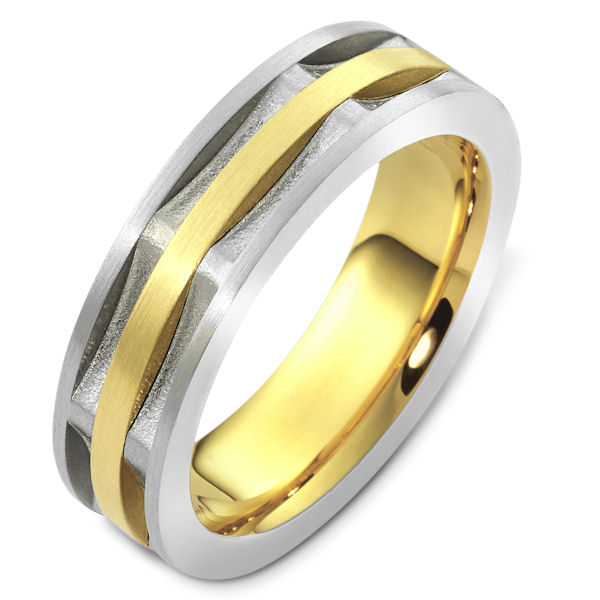 18kt Two-tone gold contemporary, comfort fit, 6.5mm wide wedding band. The ring has a mix of matte and sandblast finish. In the grooves, the ring has a sandblast finish. The rest is matte. It is 6.5mm wide and comfort fit.
