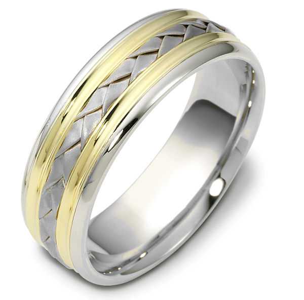 18kt Two-tone gold hand crafted, comfort fit, 7.0mm wide wedding band. The ring has a beautiful hand crafted braid in the center that has a matte finish. The rest of the band is polished. Different finishes may be selected or specified.
