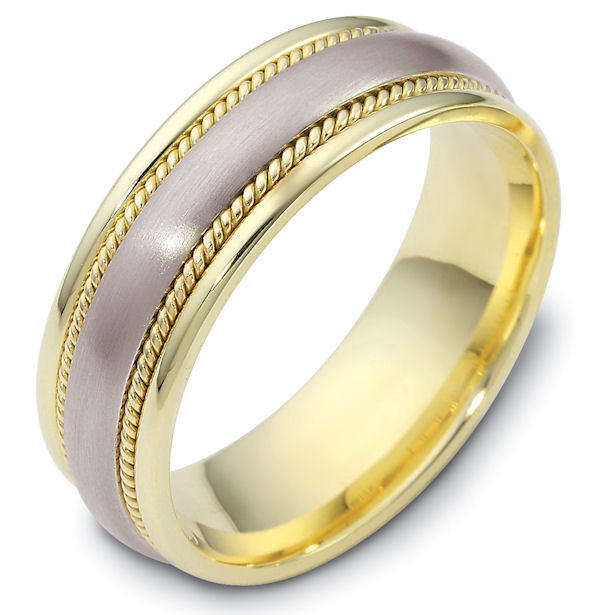 Platinum and 18kt yellow gold classic, comfort fit, 7.0mm wide wedding band. The ring has a mix of classic and handcrafted ropes. The center has a matte finish and the rest of the band has a polished finish. Different finishes may be selected or specified.