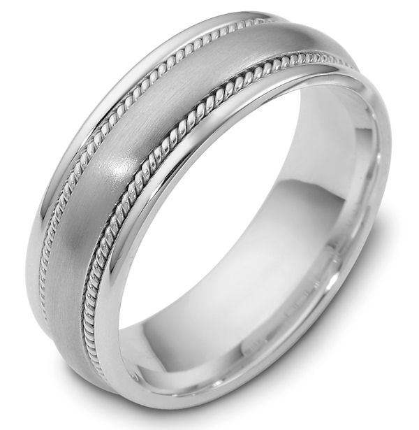 18kt White gold classic, comfort fit, 7.0mm wide wedding band. The ring has a mix of classic and handcrafted ropes. The center has a matte finish and the rest of the band has a polished finish. Different finishes may be selected or specified.