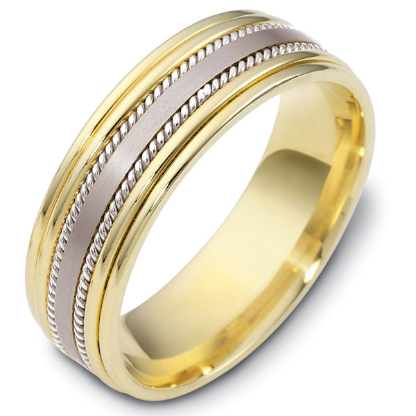 14kt Two-tone gold classic, comfort fit, 7.0mm wide wedding band. The ring has a mix of handcrafted ropes and classic style. The center portion has a matte finish and the rest of the band has a polished finish. Different finishes may be selected or specified.