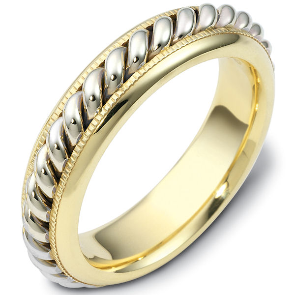 18kt Two-tone gold handcrafted, comfort fit, 6.0mm wide wedding band. There is one hand crafted rope in the center that has a polished finish. The whole ring is polished. Different finishes may be selected or specified.