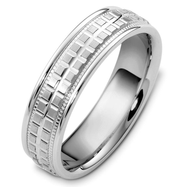 18kt White gold contemporary, comfort fit, 6.0mm wide wedding band. The ring has a carved pattern around the whole band. It is a polished finish. Different finishes may be selected or specified.