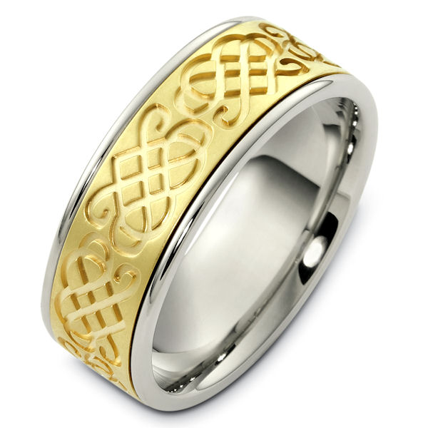 18kt Two-tone gold celtic, comfort fit, 8.0mm wide wedding band. The celtic design is around the whole band and has a matte finish. The rest of the band is polished. It is 8.0mm wide and comfort fit.