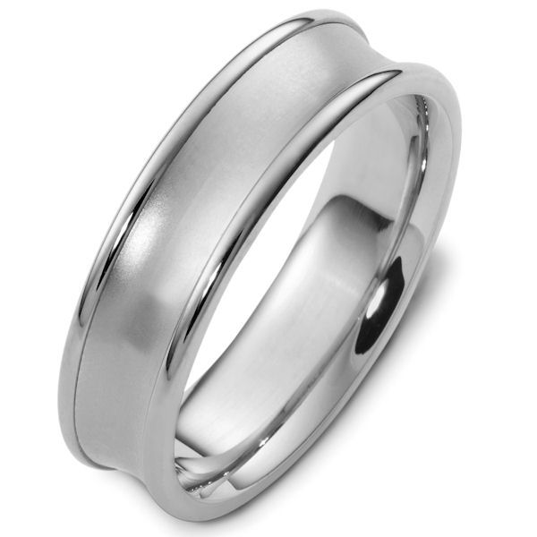 14kt White gold classic, comfort fit, 6.0mm wide wedding band. The center of the ring is dipped inward and has a matte finish. The edges are polished. Different finishes may be selected or specified.