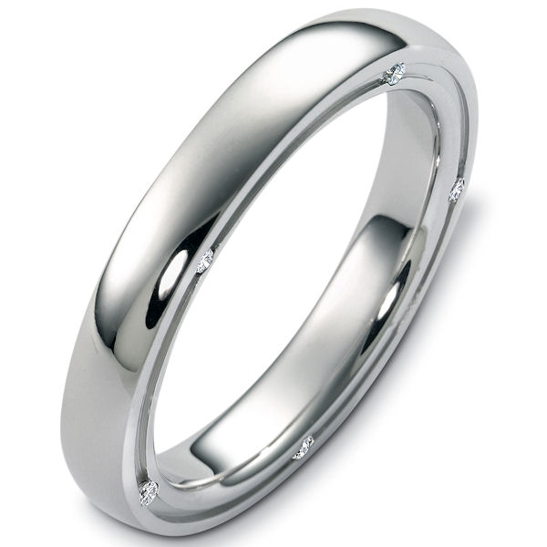 Platinum diamond, comfort fit, 4.0mm wide wedding band. Diamond's total weight is 0.10 ct tw are graded as VS1-2 in clarity G-H in color. There are about 10 round brilliant cut diamonds, 5 around each edge, each measures 0.01 ct. The ring has a polished finish. Other finishes may be requested.