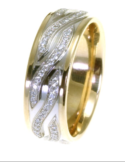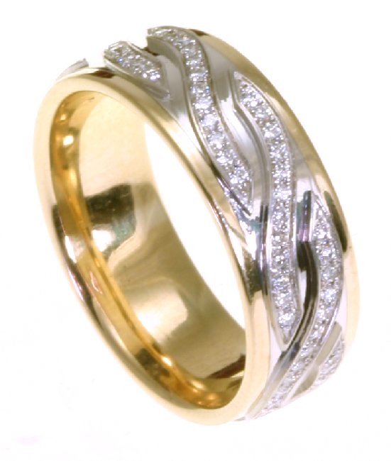 14kt Two-tone gold diamond, comfort fit, 7.0mm wide wedding band. The diamonds are approximately 0.44 ct tw, VS1-2 in clarity and G-H in color. There are about 96 brilliant round cut diamonds and each measures about 0.005 ct. It is 7.0mm wide and comfort fit.