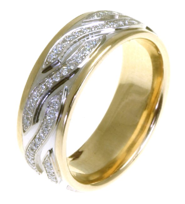 18kt Two-tone gold diamond, comfort fit, 7.0mm wide wedding band. The diamonds are approximately 0.44 ct tw, VS1-2 in clarity and G-H in color. There are about 96 brilliant round cut diamonds and each measures about 0.005 ct. It is 7.0mm wide and comfort fit.