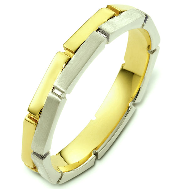 18kt Two-tone gold contemporary, comfort fit, 4.0mm wide wedding band. The ring has one side polished and the other matte finish. It is 4.0mm wide and comfort fit.