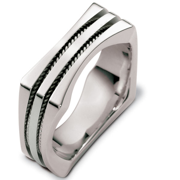 18kt White gold contemporary, comfort fit, 8.0mm wide wedding band. The ring is a square shape with two hand crafted ropes inserted inside the band. It is 8.0mm wide, polished finish, and comfort fit.