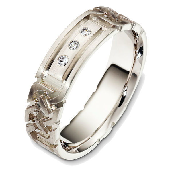 Palladium diamond and carved, comfort fit, 6.0mm wide wedding band. The diamond's total weight is 0.06 ct with a quality of VS1-2 in clarity and G-H in color. There are 3 round brilliant cut diamonds, each measure 0.02ct. The ring has beautiful carvings around the band. It is 6.0mm wide, comfort fit and has a matte finish.
