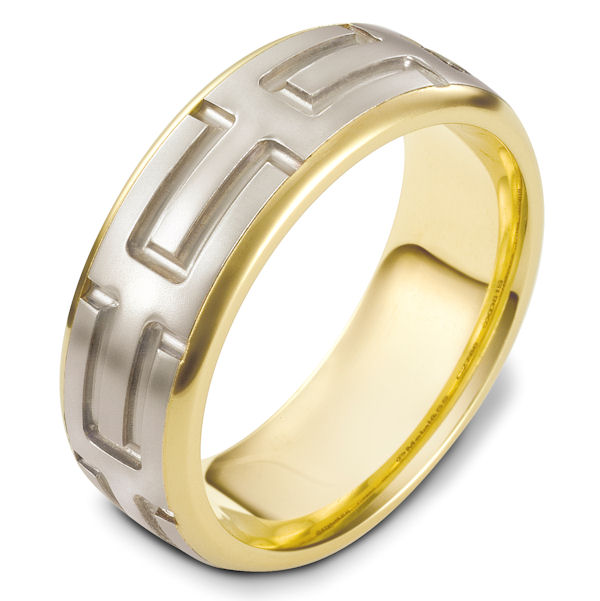 14kt Two-tone gold carved, comfort fit, 8.0mm wide wedding band. The ring has a beautiful carved pattern around the whole band. The center portion is a matte finish and the edges are polished. It is 8.0mm wide and comfort fit.