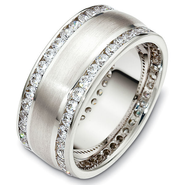 Palladium diamond eternity, comfort fit, 8.5mm wide wedding band. The ring has approximately 1.90 ct tw diamonds, VS1-2 in clarity and G-H in color. There are about 76 round brilliant cut diamonds, each measures 0.025 ct. The number of stones may vary depending on the size of the ring. Larger rings will have more stones and diamond weight. Smaller rings will have less stones and diamond weight. The ring has a matte finish. Different finishes may be selected. It is 8.5mm wide and comfort fit.