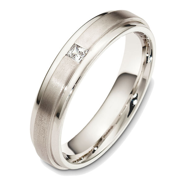 Platinum diamond, comfort fit, 5.0mm wide wedding band. The ring has one princess cut diamond, 0.07 ct, VS1-2 in clarity and G-H in color. The ring has a matte finish in the center and polished on the edges. Different finishes may be selected. The ring is 5.0mm wide and comfort fit.