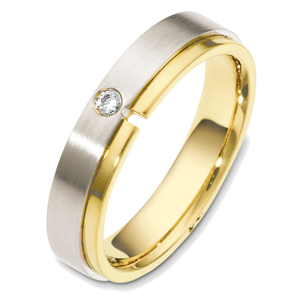 14kt Two-tone gold diamond, comfort fit, 5.0mm wide wedding band. The ring holds one round brilliant cut diamond that is 0.05 ct, VS1-2 in clarity and G-H in color. The portion with the diamond is matte finish and the rest is polished. Different finishes may be selected.