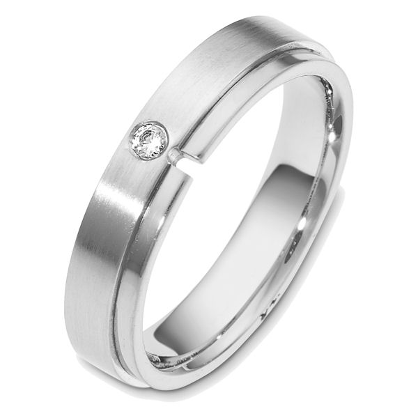 18kt White gold diamond, comfort fit, 5.0mm wide wedding band. The ring holds one round brilliant cut diamond that is 0.05 ct, VS1-2 in clarity and G-H in color. The portion with the diamond is matte finish and the rest is polished. Different finishes may be selected.