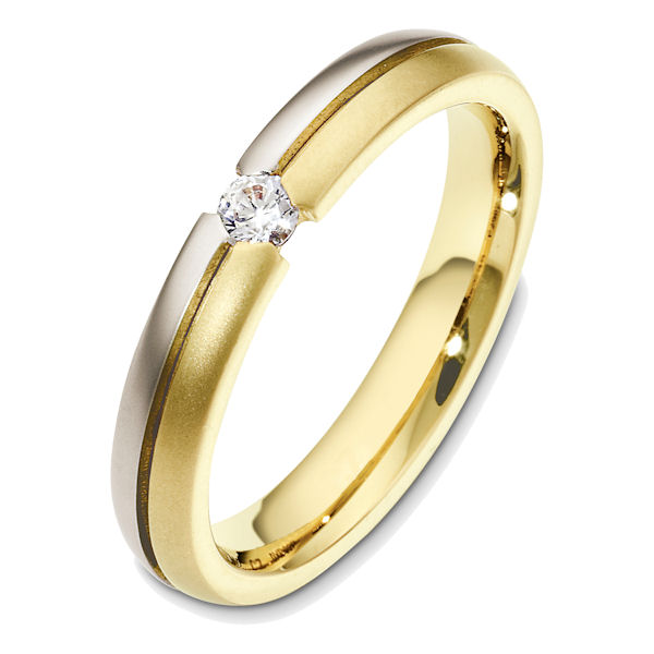 14kt Two-tone gold diamond, comfort fit, 4.0mm wide wedding band. The ring holds one round brilliant cut diamond that is 0.18 ct, VS1-2 in clarity and G-H in color. The ring has a matte finish. Different finishes may be selected or specified.