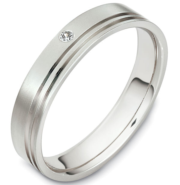 14kt White gold diamond, comfort fit, 4.5mm wide wedding band. The ring holds one round brilliant cut diamond that is 0.02 ct, VS1-2 in clarity and G-H in color. There are 2 carved lines around the whole band. It is 4.5mm wide, comfort fit, and has a matte finish. Different finishes may be selected.