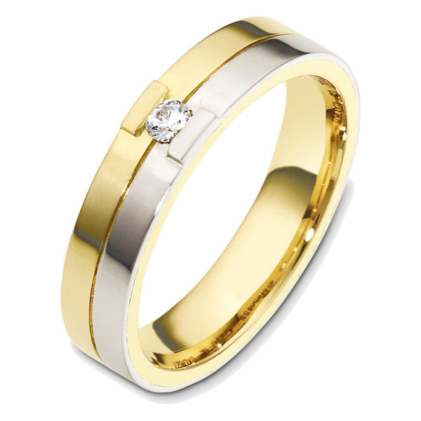 14kt Two-tone gold diamond, comfort fit, 5.0mm wide wedding band. The ring holds one round brilliant cut diamond that is 0.08 ct, VS1-2 in clarity and G-H in color. The ring is polished finish. Different finishes may be selected.