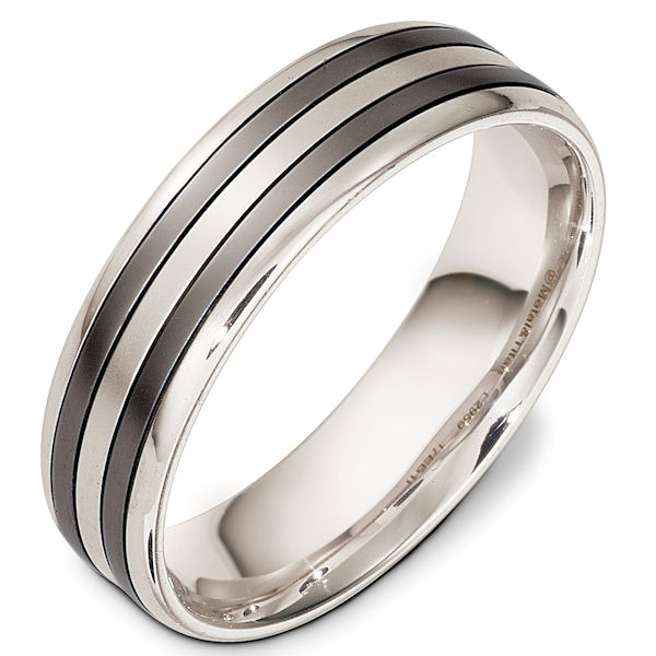 Titanium and 14kt white gold classic, comfort fit, 6.0mm wide wedding band. The ring has a matte finish. Different finishes may be selected.