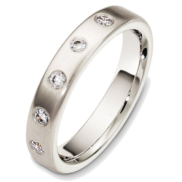 Palladium diamond, comfort fit, 4.0mm wide wedding band. The diamonds are 0.20 ct tw, VS1-2 in clarity and G-H in color. There are about 5 round brilliant cut diamonds, each measures 0.04 ct. The ring has a matte finish. Different finishes may be selected.