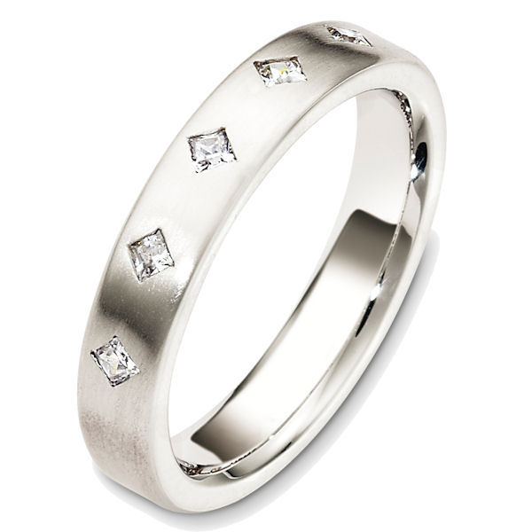 Platinum diamond, comfort fit, 4.0mm wide wedding band. The diamonds are 0.25 ct tw, VS1-2 in clarity and G-H in color. There are 5 princess cut diamonds, each measures 0.05 ct. The ring has a matte finish. Different finishes may be selected.